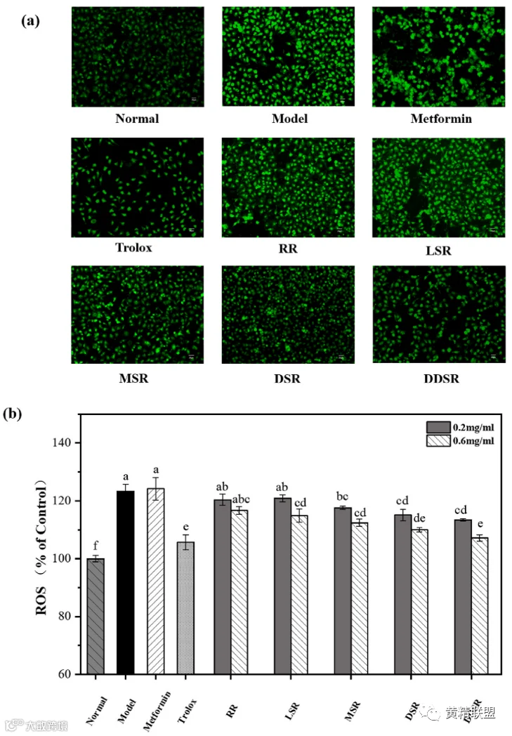 图 6. 细胞内ROS荧光染色的代表性图像(× 20放大倍数),及其荧光强度(b)。
