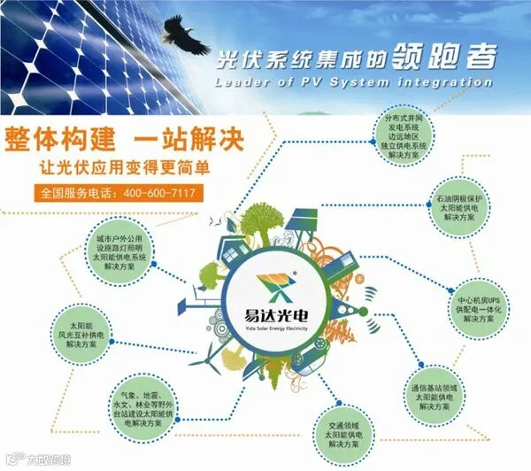 易达光电是由杭州易达光电有限公司、辽宁易达光电有限公司、吉林省易达光电有限公司、哈尔滨易达光电有限公司、杭州易达光电有限公司西北分公司等若干个分公司组成的一个以太阳能发电系统等可再生能源产品为主营业务的高科技平台公司。所属的杭州易达光电有限公司位于杭州市临平区,借助江浙沪光伏上游优势资源和互联网资源,以品牌运营总部定位,吉林省易达光电有限公司作为吉林省区运营中心,辐射乌兰浩特,哈尔滨易达光电有限公司作为黑龙江省运营中心,辐射呼伦贝尔。公司专业从事光伏发电、风力发电、整体机房一体化等系统的设计、安装以及系统中关键设备的研发制造及提供配套服务,并可承接风光互补电站系统和整体机房一体化系统集成交钥匙工程。
