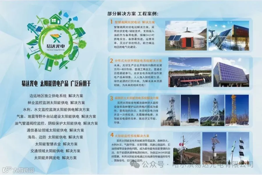 杭州易达光电有限公司专注太阳能光伏发电20多年,厂家直销太阳能发电设备,批发太阳能板,胶体电池,控制器,逆变器,光伏支架,太阳能路灯ups蓄电池,在全国东北辽吉黑西北新疆内蒙大区建立了本地化仓储运营,整体构建一站解决方案设计,快速交接。