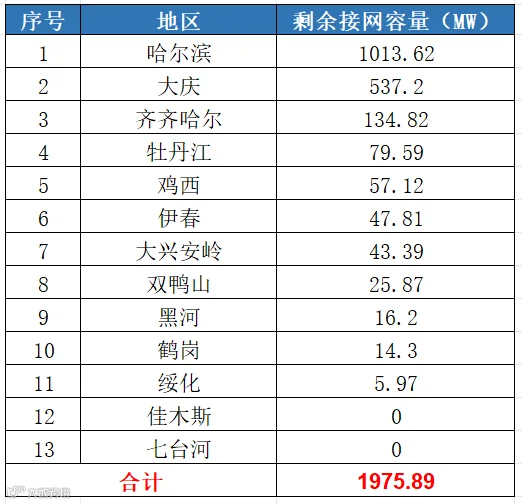 2023年12月25日,黑龙江发改委发布《关于分布式光伏接入电网承载力情况的公告》,公告显示:截至2023年11月底,黑龙江13个地区剩余分布式接网容量1975.89MW。