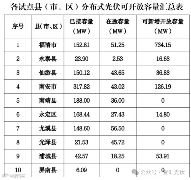 2023年11月20日,福建省发改委发布《关于发布试点县分布式光伏接入电网载力信息的通告》,将10个试点县截至2023年第三季度末的分布式光伏接入电网承载力评估结果向社会发布,结果如下表所示。