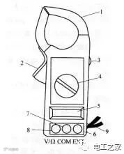 1-钳头2-钳头扳机3-保持开关4-旋转开关5-显示器6-绝缘测试附件接口7-公共地端8-电压电阻输入端9-手提带