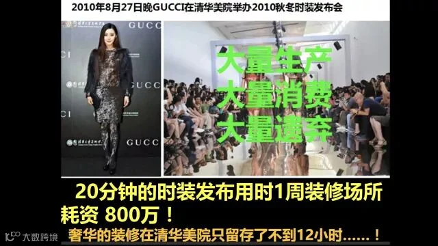 2010年Gucci在清华美院展览室办时装发布会,20分钟的表演,一个礼拜装修,八百万扔进去了,20分钟以后拆掉。这种事情在世界上天天发生,中国的车展,全世界的车展,花的钱几百倍于这个。