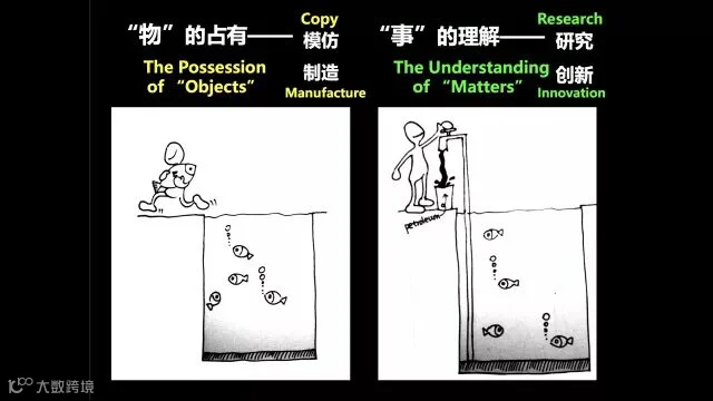 这张图更说明问题,我们习惯于左边,广东的鱼好吃,就把广东的鱼引到北京,马上就能吃到了,但是过个两三年就退化了;而右边则要研究广东鱼的DNA是什么,适合它的水土、温度、鱼食是什么,气温多高,我到北京来培养自己的鱼。