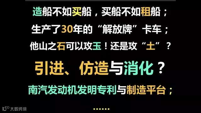我1949年上小学,跟着我们新中国一块儿成长的,我听到的话都是,“造船不如买船,买船不如租船”。1957年建成的解放牌长春汽车厂,头一年的产量就超过全日本的卡车总产量,了不得吧?