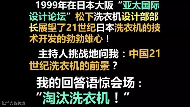1999年,上个世纪末,日本开了一个亚太国际设计会议,松下洗衣机设计部长,在大谈二十一世纪松下洗衣机的技术有多牛,讲得天花乱坠,接着主持人问:“柳先生,你讲讲中国二十一世纪洗衣机怎么样?”