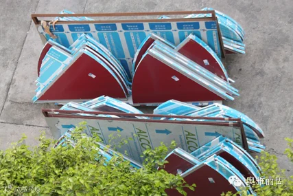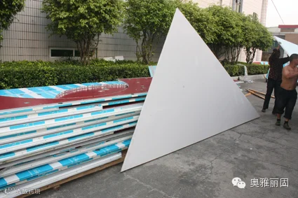 单个三角蜂窝板近照边长和高均有2米多,需要3个人才能装上去。