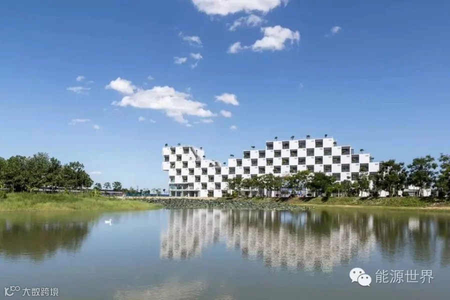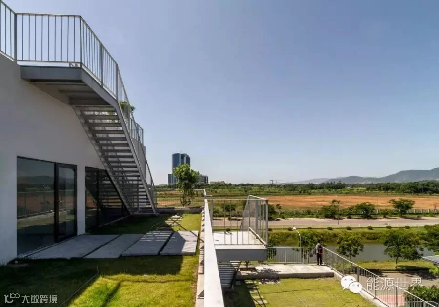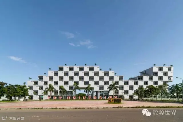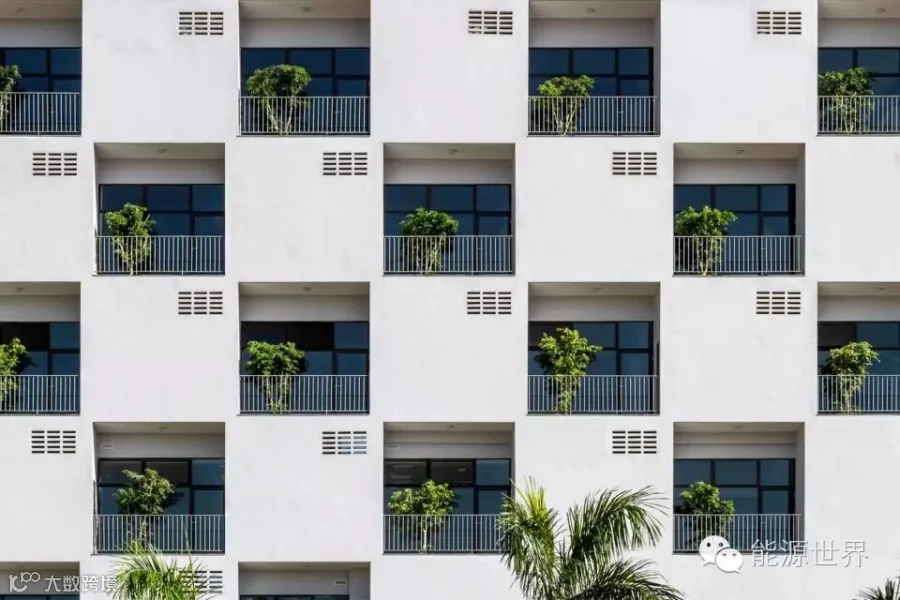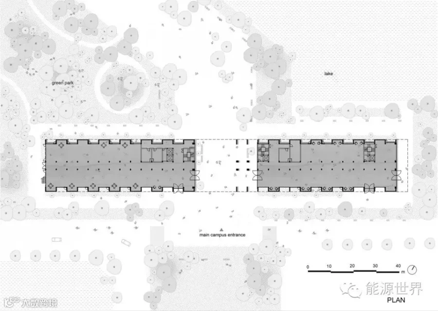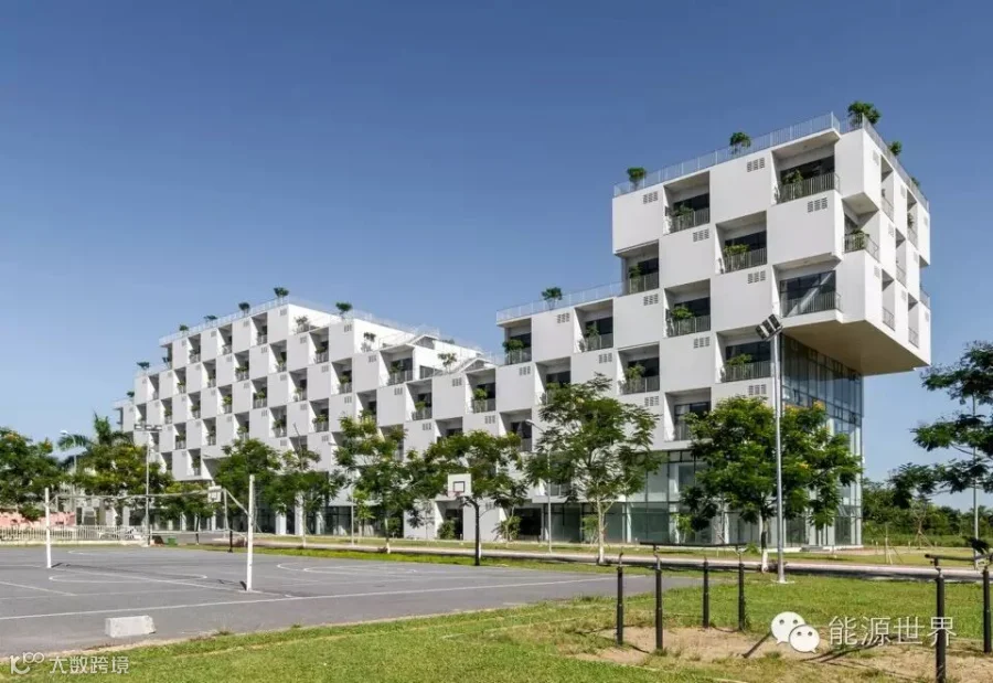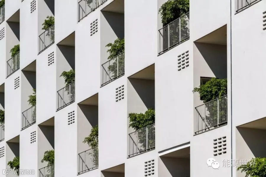 FPT大学位于越南能源短缺的地方,因此我们采用被动式设计来减低建筑物对主动系统的依赖,这样在停电的时候,这栋楼能够在消耗最少备用电源电量的情况下正常使用。该方案还把充足的自然光引入楼内,从而减少人工照明的需求。开窗里的绿植起到了皮肤的作用,减小了通过窗户的直接热传递。这栋楼对着风口,利用交叉通风降温。同时,绿植和楼边的湖有助于降低大气温度。