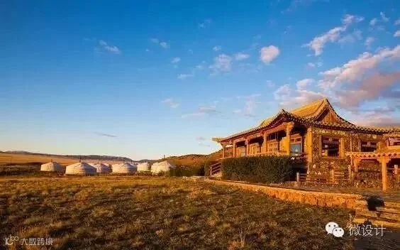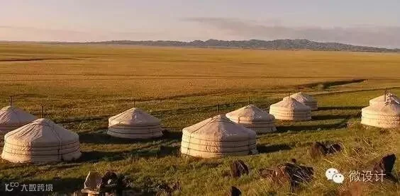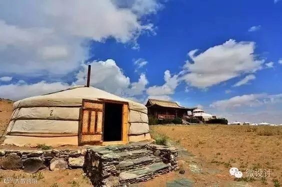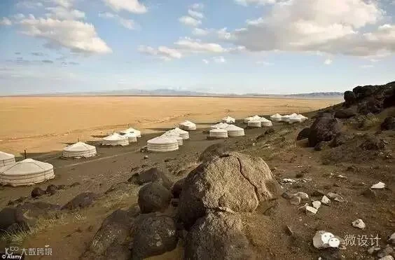 在蒙古戈壁的阿尔泰山脉背景下,散落着被毛毡覆盖的蒙古包,星星点点地缀在广袤的戈壁之上。蒙古包内设置有烧木头的火炉、毛毡地毯、具有当地特色的家具、手绘木质床铺。