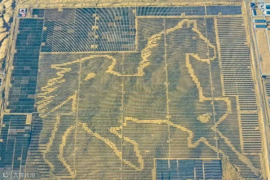 内蒙古自治区鄂尔多斯市达拉特旗,茫茫库布齐沙漠中一幅蔚为壮观的“骏马图”跃然于黄沙之上。这可不是沙画,而是由国家电投建设的“骏马”光伏电站,由19.6万块光伏板组成。这匹“骏马”不仅能发电,还能进行沙漠治理和生态修复。