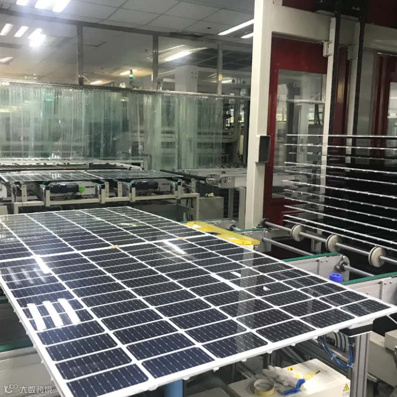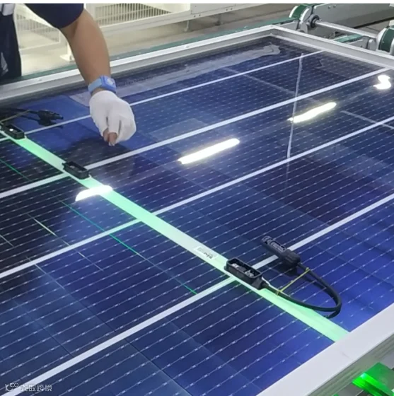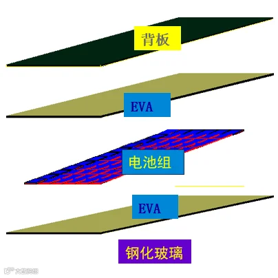 叠层工序主要将电池串继续进行电路连接,用玻璃、EVA胶膜、背板将电池片封装保护。