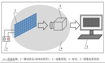 EL测试:根据半导体辐射复合释放光子的特点,对组件施加正向电压注入非平衡载流子,并通过光子探测器接收非平衡载流子辐射复合释放的光子,非平衡载流子浓度越高(正常区域)释放的光子越多,EL显示图像越亮,非平衡载流子浓度越低(缺陷区域)释放的光子越少,EL图像越暗,通过图像明暗关系即可反应组件内部电池缺陷情况。