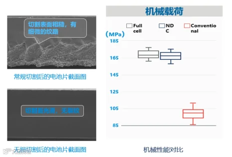 传统切片技术采用激光在超过1500℃的高温条件下对硅片表面进行熔融,切开一定深度后通过机械应力掰断,在切割面会存在细微的裂纹,最终影响电池片的机械轻度。天合光能210至尊组件采用行业领先的无损切割技术,使用低温激光技术,结合热胀冷缩的原理,硅片通过热应力自然分开,切割面不会产生任何微裂纹,切割后的电池片机械强度与未切割的整体电池片强度相当,远高于传统切割的电池片。