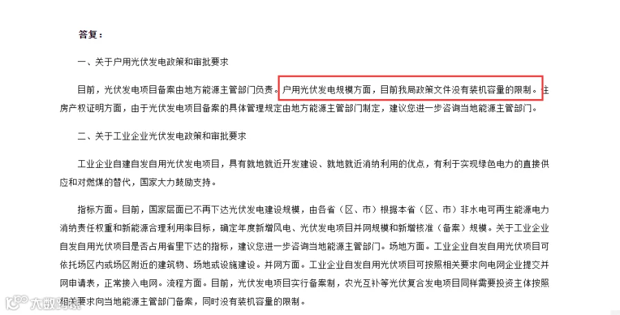 2021年10月27日,国家能源局在回复《关于光伏发电政策的咨询》时明确表示,目前,光伏发电项目备案由地方能源主管部门负责。户用光伏发电规模方面,目前我局政策文件没有装机容量的限制。