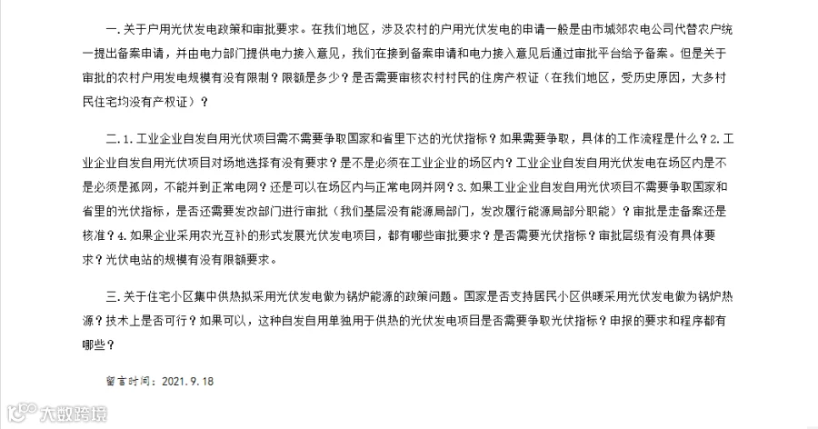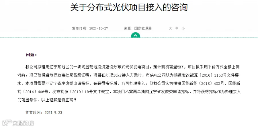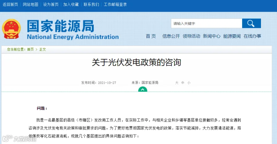 同是在2021年10月27日,国家能源局在回复《关于分布式光伏项目接入的咨询》中表示,从2019年起,国家能源局对光伏发电不再采取规模管理,分布式光伏项目不存在占用年度规模指标的问题。
