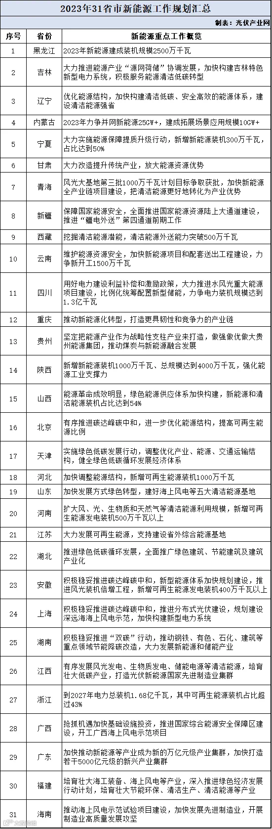 截至目前,全国31个省(市、区)2023年政府工作报告已相继发布。新能源是各省能源工作的重点,日前,各省根据自身资源特点规划其2023年绿色转型低碳发展,含拟定新增新能源装机目标、大力推进区域基地发展、围绕新能源产业强链补链等工作部署。根据各省政府工作报告中涉及能源、新能源相关的重点内容。整理如下