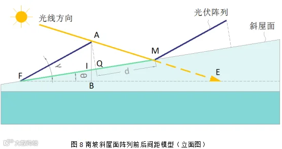 示意图参考上文图5,这里以南坡为例进行分析。这里分析的方法是将光线和前后阵列组件作南北向的投影,如图8所示。假设某一时刻太阳的方位角为β,高度角为α,组件与屋面夹角γ,屋面坡角θ,光线经过组件的最高点A,与假想水平面相交于E点,与屋面相交于M点。B为组件最高点在水平面的正投影,AQ⊥屋面,|QM|为需要求解的阵列前后的绝对间距d,|FM|为阵列前后的间距(或称中心距),|FQ|为组件在屋面上的投影距离,则可将问题转化到△FAE和△AQM中求解,那么阵列前后间距则为:|FM|=|FQ|+|QM|。