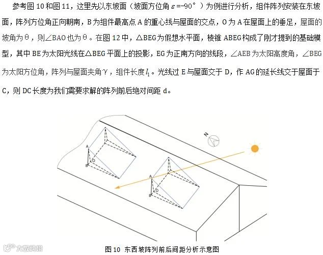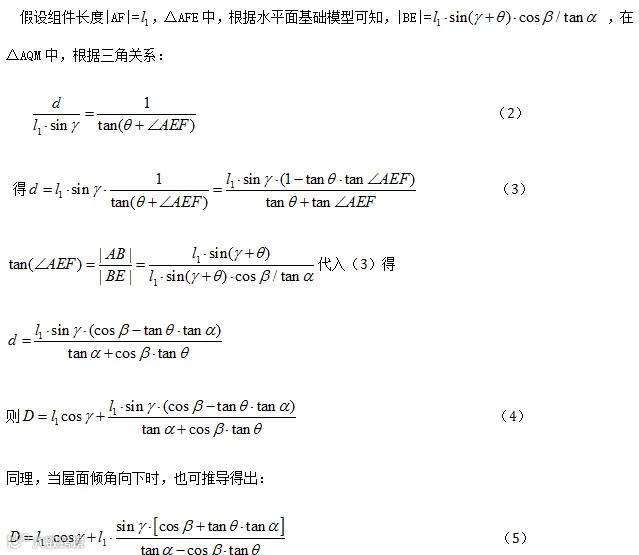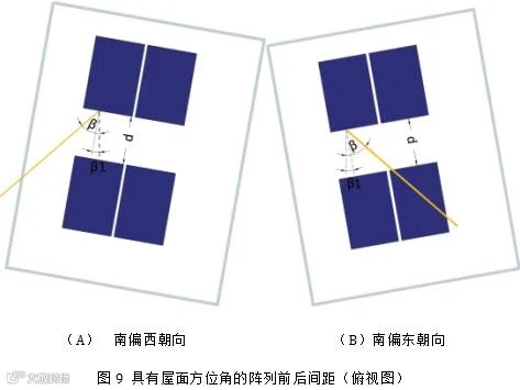 上面推导是假设屋面方位角为0°时的情况,实际屋面方位角可能往南偏东或偏西方向。如果是水平屋面,若方位角发生偏移,组件排布仍可以选择正南朝向安装,也可以和屋面方位角保持一致,具体需要视方位角大小对发电量的影响程度而定,但是斜屋面坡面不同,若方位发生偏移,则组件阵列需要同时跟着偏移。