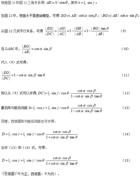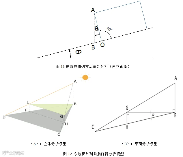 在水平面阵列间距计算经典模型的基础上,下文依次对上述两种典型坡向的平屋面进行详细分析,第一种是南北坡面,第二种为东西坡面,然后再推广到含有坡面方位角变量的通解公式。