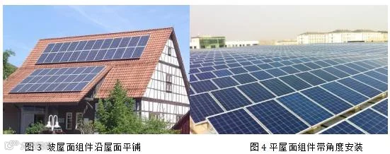 从光伏组件安装应用角度,目前使用最广泛的为平屋面,如工业彩钢瓦屋面、混凝土屋面,而坡屋面主要为别墅类,因坡屋面自身坡度较高,所以光伏组件一般沿着屋面平铺,参照图3。而平屋面的坡角较小,则需要设计一定的安装倾角来获得更高的发电效率,参照图4。