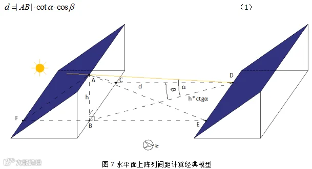在分析上述两种屋面阵列前后间距之前需要先回到水平屋面模型上来,如图7为水平面阵列间距的计算模型,相关参数已在图中标注,具体可参考相关文献。在这里我将三棱锥BCDA和三角形AFE称为水平面上的前后间距计算基础模型,这两个模型非常有用,是复杂坡屋面分析的基础。