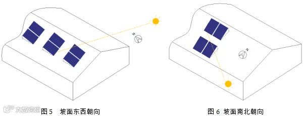 平屋面可分为坡角为0°角和不为0°角两种,按照坡面朝向又可以分为东西坡和南北坡屋面,如图5为东西朝向双坡面,图6为南北朝向双坡面,这两种屋面光伏阵列朝南安装在南坡或北坡。当然这两种屋面可能同时存在主坡和副坡,也可能存在一定的方位角,为计算方便起见,这里坡面的方位角定义为坡面法线方向在水平面的投影和正南方向的夹角,偏西为正,偏东为负。