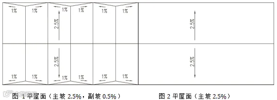 通常情况下,屋面一般按其坡度的不同分为坡屋面(屋面排水坡度大于10%)和平屋面(屋面排水坡度小于5%)两大类。对于平屋面,一种是只有横向排水坡度(或称为主坡),没有纵向排水坡度(或称为副坡、边坡),另一种则稍复杂些,同时存在主坡和副坡,副坡和主坡形成一定的角度,两种情况参考图1和图2。主坡较常见的为2%~3%,副坡为0.5%~1%。