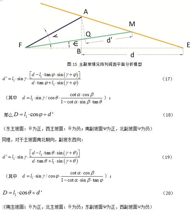 根据上述第2点分析出来的公式,可求解出东西坡阵列前后绝对间距d,得到这个值后,进入第二步,如图15在三角形FAE中,|BE|为d,代入第1点所讲的斜面公式,可求解d’。