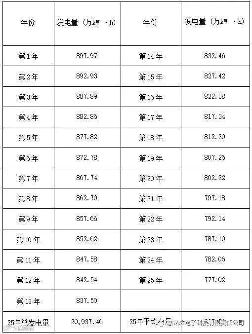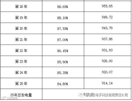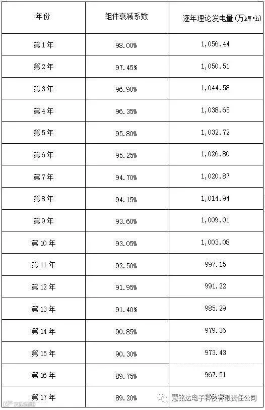 光伏电站的第一年理论发电量为光伏电站的最大理论发电量乘 太阳电池组件第一年的衰减系数(首年为98%,往后每年以0.55%衰减)。