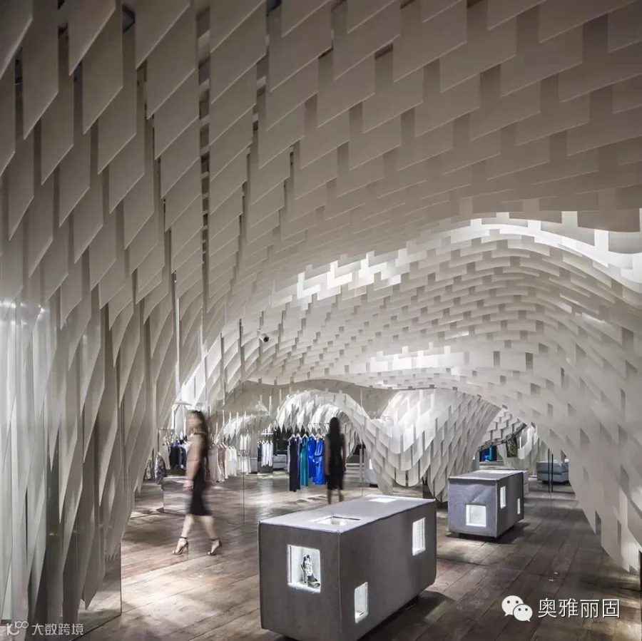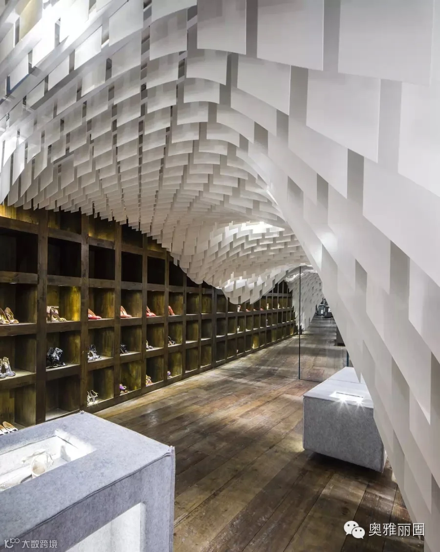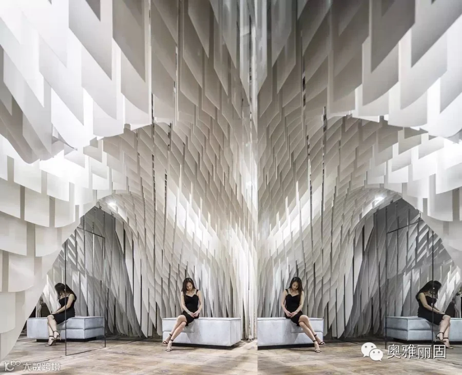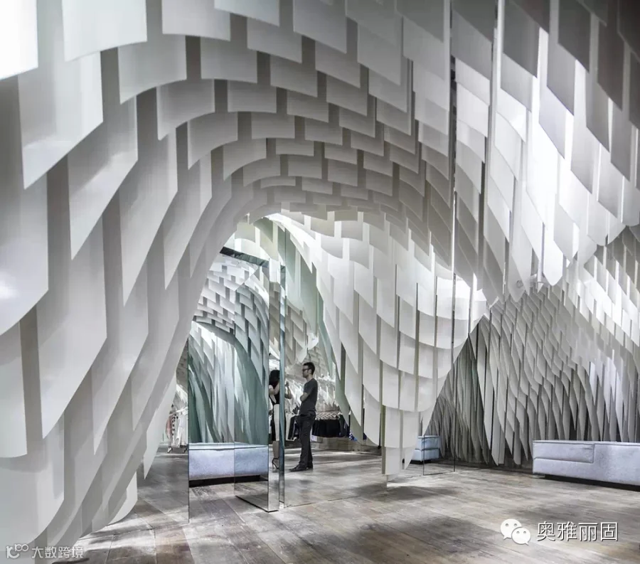 在面积不大的空间内由上万绿色节能光反射蜂窝板形成垂坠片,与设计中安置的镜面玻璃巧妙地构造出连绵不绝的视觉冲击,与此同时还构建出了飘渺的内部环境让人忘我并迷失于这片时尚“帘洞”中。