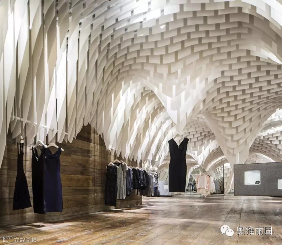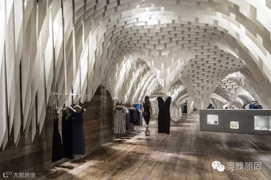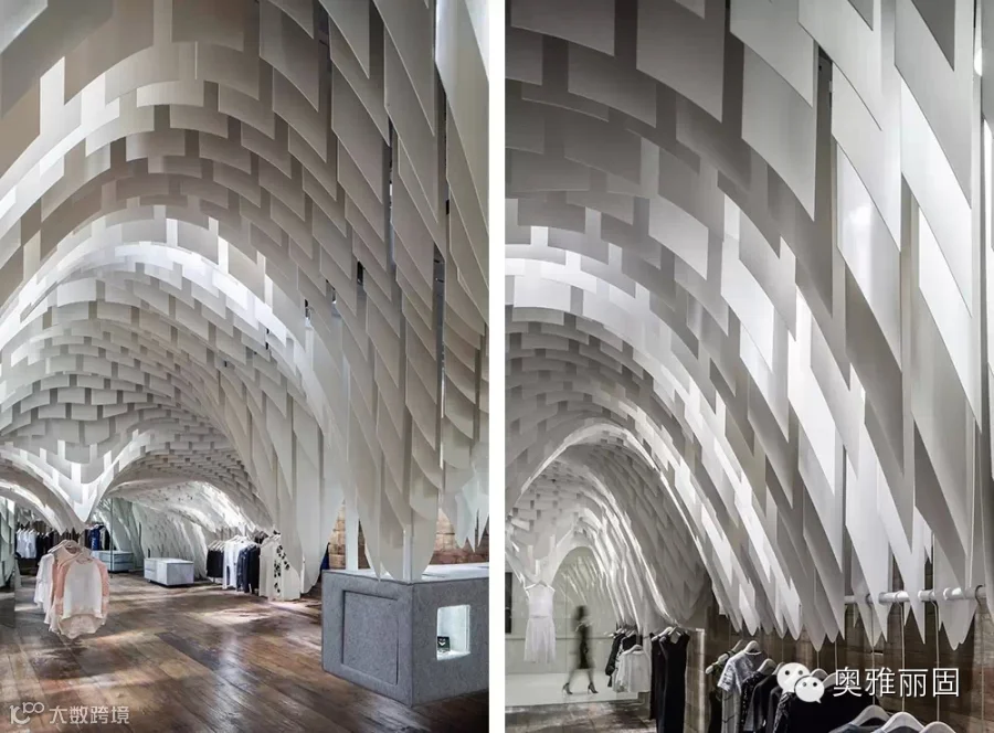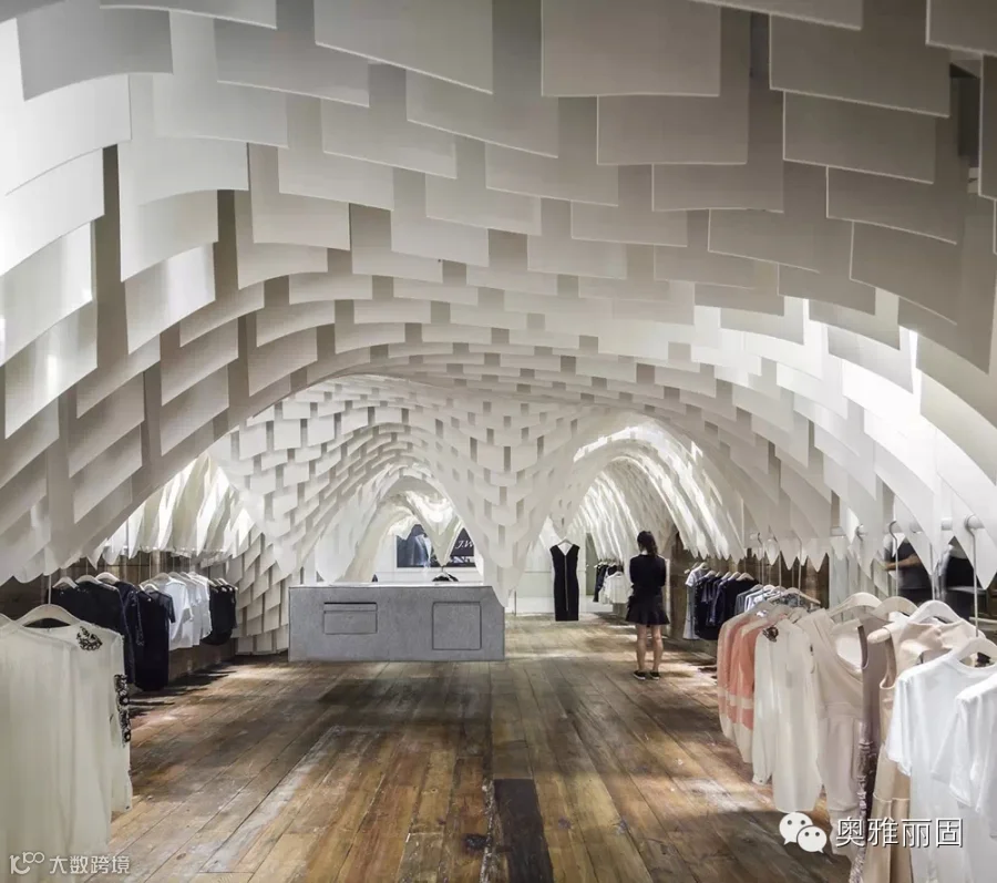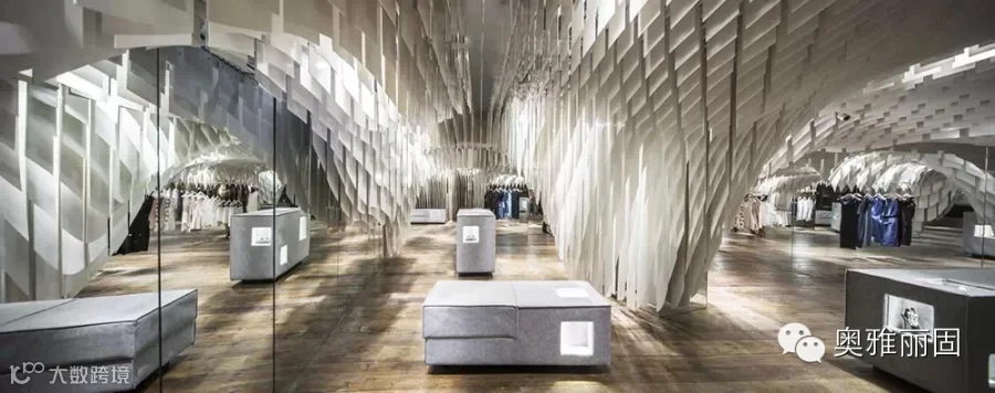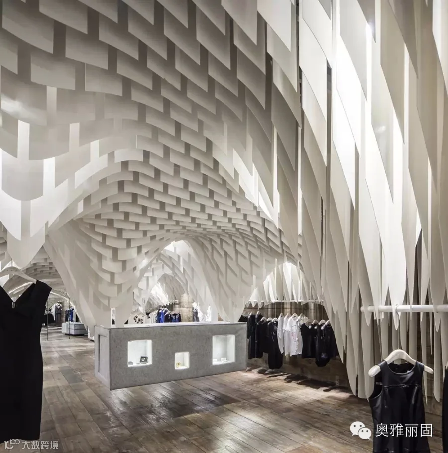 在面积不大的空间内由上万绿色节能光反射蜂窝板形成垂坠片,与设计中安置的镜面玻璃巧妙地构造出连绵不绝的视觉冲击,与此同时还构建出了飘渺的内部环境让人忘我并迷失于这片时尚“帘洞”中。