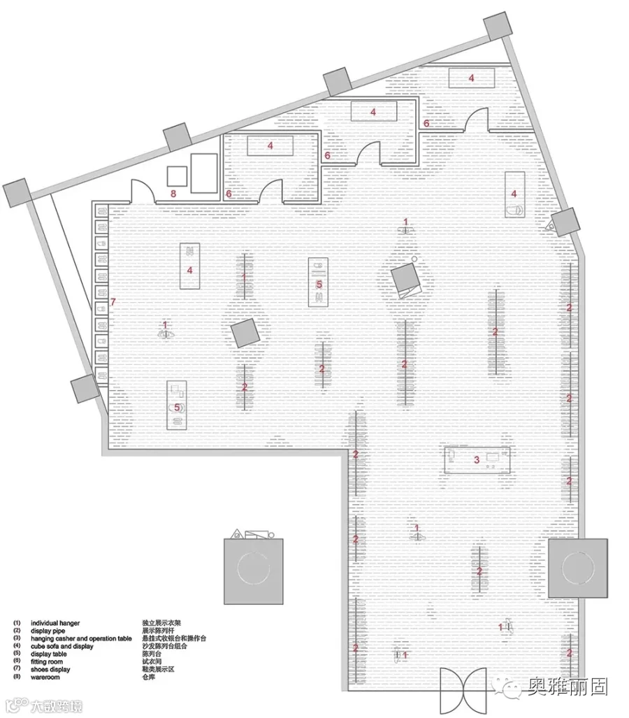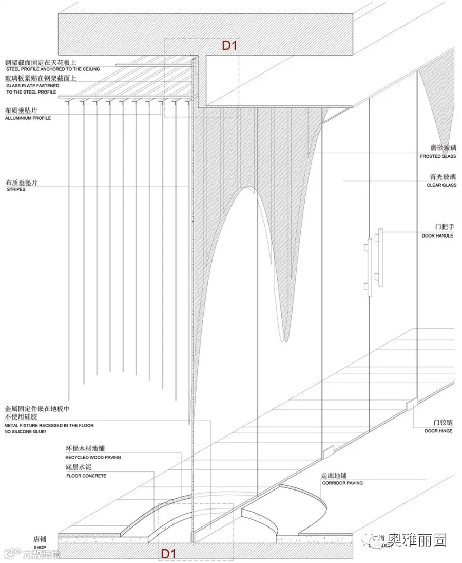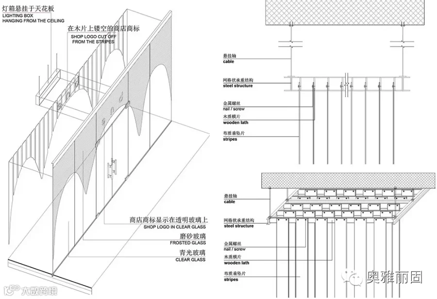 这片谜样的天空垂坠片无疑是该空间的绝对主角,因此使用了回收木材装点室内铺地及墙面而从在整体环境中更凸显坠片所制造的“幻境”。