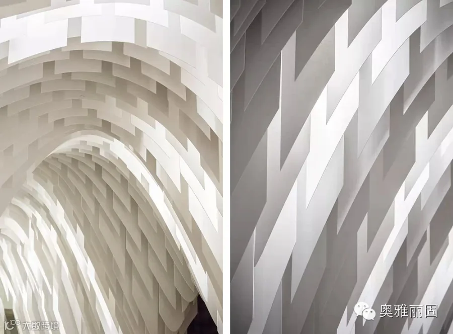 由我司根据模型软件来模拟绿色节能光反射蜂窝板天花吊顶用材的物理特性创造设计;其次我们充分考虑到了室内中所必须的一些设备,例如:照明、音响、消防喷淋、摄像头、空调和通风等;以“可渗透”型的半开式吊顶外观形式,让“从天而降”的设计理念顺然而然浮出水面。