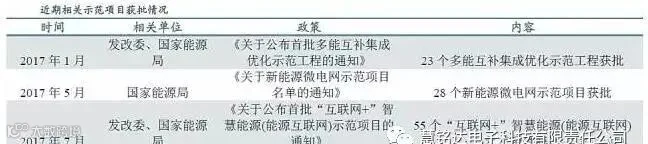《办法》规定,微电网须具备微型、清洁、自治、友好等基本特征。电源以当地可再生能源发电为主,或以天然气多联供等能源综合利用为目标的发电形式,鼓励采用燃料电池等新型清洁技术。其中,可再生能源装机容量占比在50%以上,或天然气多联供系统综合能源利用效率在70%以上。《办法》中明确提出微电网内部的新能源发电项目建成后,按程序纳入可再生能源发展基金补贴范围。近期相关示范项目获批情况见下表。