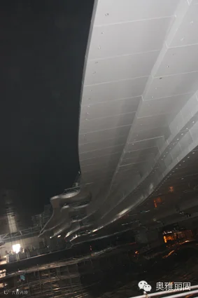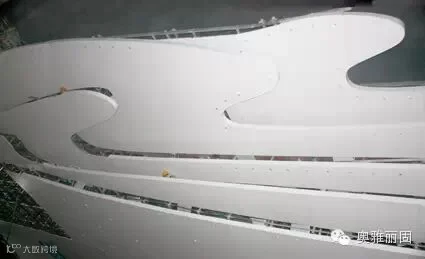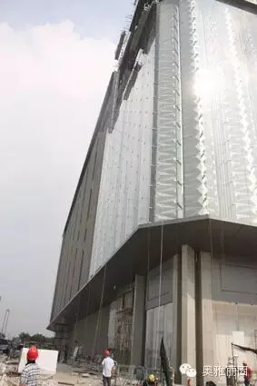 图为星光联盟项目外幕墙挑檐部位,采用厚25mm每块均长4m的蜂窝铝板围绕而成。