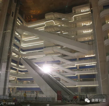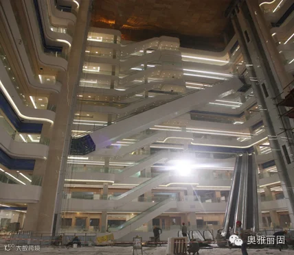 中庭精致的设计、垂直的空间,我司供应了广告位及扶梯部位,扶梯部位采用我司9米超长蜂窝铝板一次成型复合精制而成,解决板与板的拼缝不齐、组合不美观的问题。