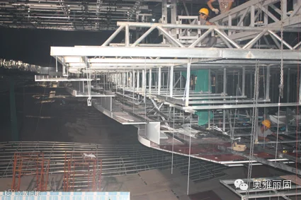 系统采用间距450mm高密度优质材料的吊挂系统;能够充分满足建筑设计要求,满足70米悬空天花吊顶,满足后续灯具更换工人随意走动的承重要求。
