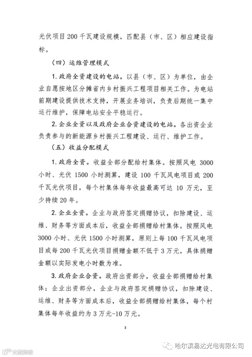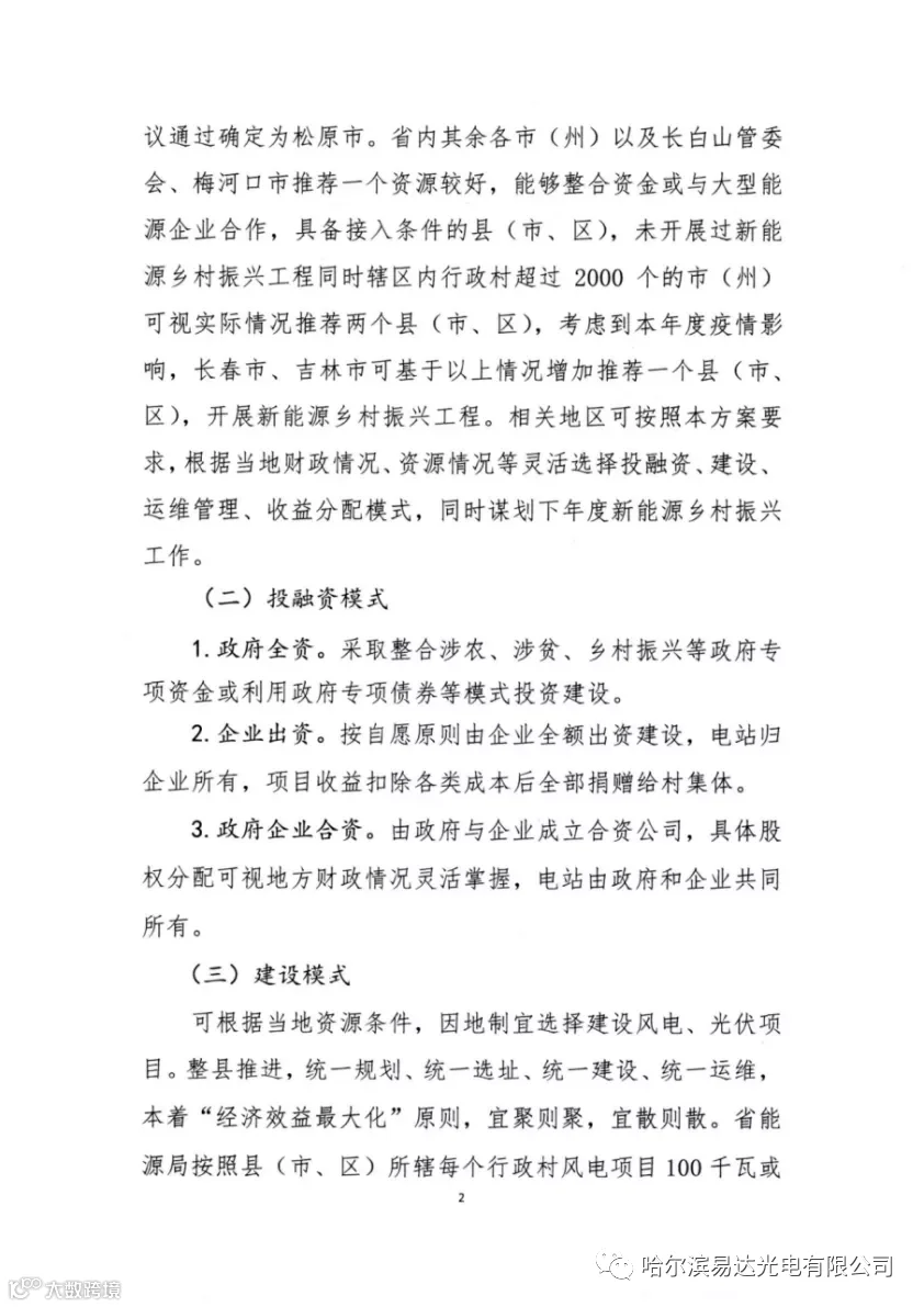 通知提到:2022年,在全省9个市(州)以及长白山管委会、梅河口市,约3000个行政村开展新能源乡村振兴工程(全省共计9034个行政村未开展乡村振兴工程,各县(市、区)行政村数量以省民政厅提供数据为准)。每个行政村建设100千瓦风电项目或200千瓦光伏发电项目,2024年度实现省内全面覆盖。