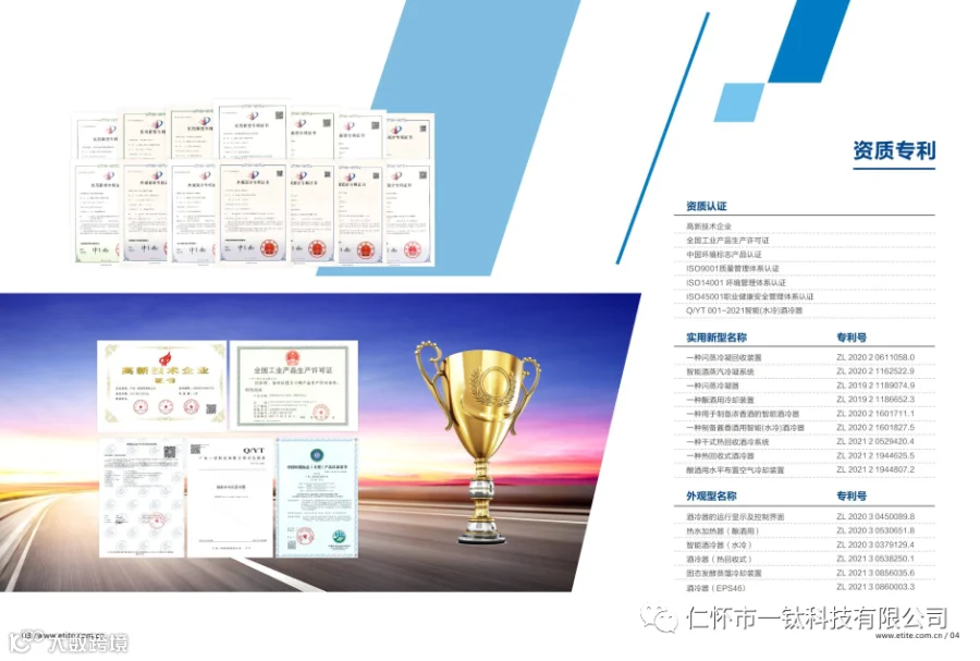 一钛是白酒冷却器行业资质更齐全的公司,酒冷器获得3C认证、全国工业产品生产许可证、中国环境产品标志认证、碳中和服务认证等各项资质专利共100余项,由中国人民保险公司承保,酒厂可以放心选择,安心使用。