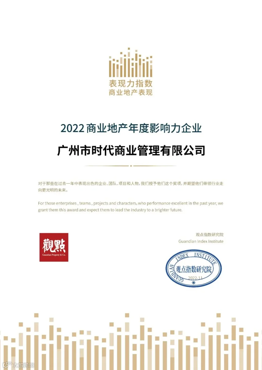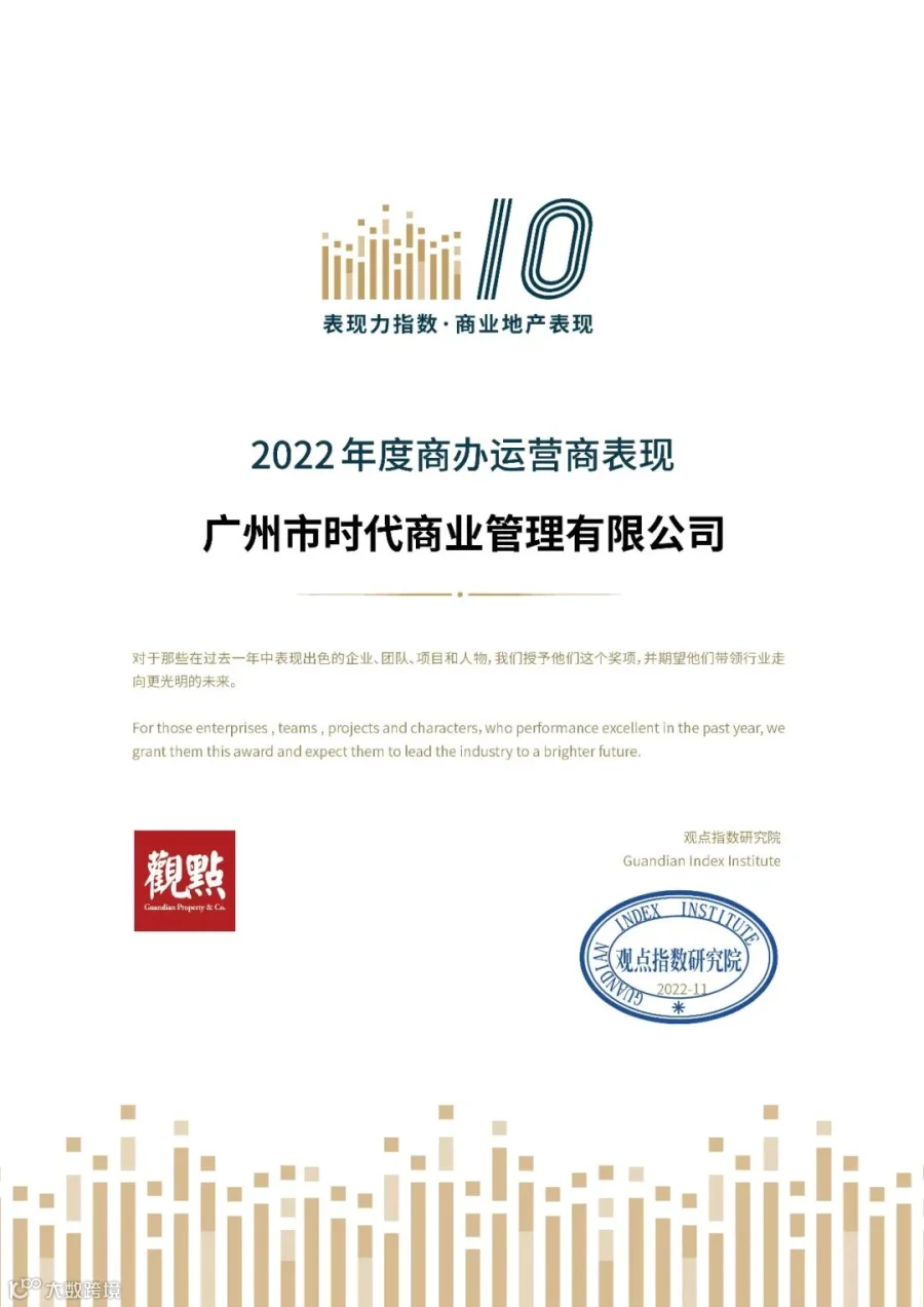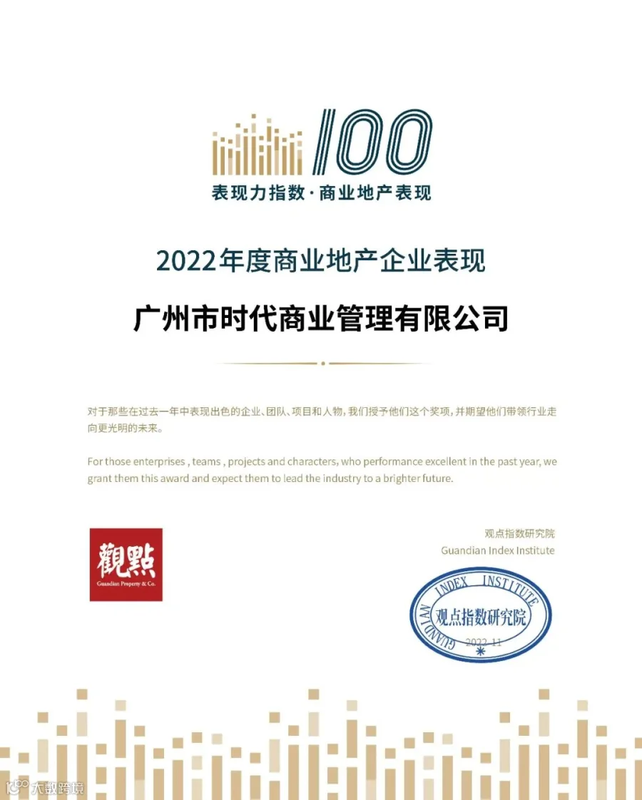 时代商业集团荣获“2022年度商办运营商表现(20强)”