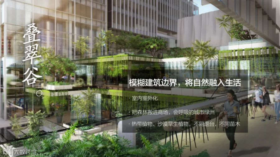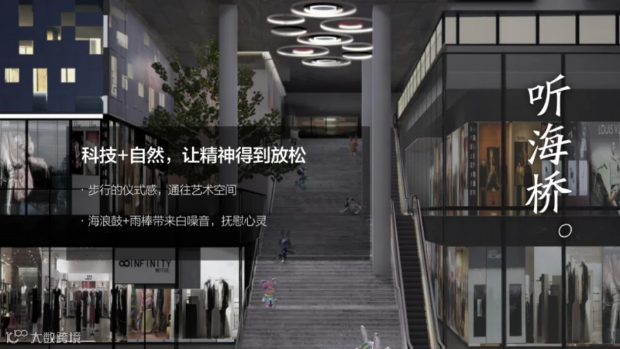 时代·芳华里CR8回归商业和生活的本质,将岭南独特的丘陵地貌、岭南人慵懒悠闲的人文特质、都市人们的社交需求融入到建筑与空间形态中,例如:铺满绿植的层层退台“叠翠谷”, 把森林搬进了商场;在艺术大台阶“听海桥”上的海浪鼓+雨棒所带来的沙沙作响的白噪音,缓解了都市人的焦虑情绪;当工作与生活边界趋于模糊时,云幕剧场、市集等公共文化空间、结合全时段的社交餐饮,为多元文化的跨界、交融和创新提供了上佳的社群场域。