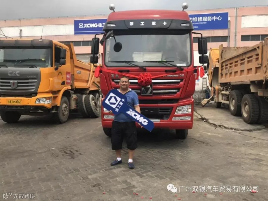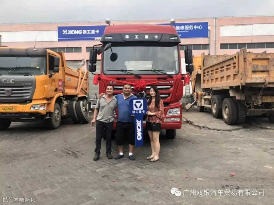 上午10点整,交车仪式正式开始。广州双银汽车贸易有限公司工作人员把徐工重卡的钥匙模板交到广州市承心物流有限公司张燕张总手中合影留念,共同见证这一激动人心的时刻。