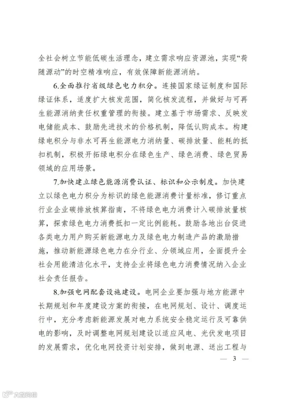 强化接入消纳保障,新增可再生能源消费在三年内不纳入各地能源消费总量;全面推行省级绿色电力积分;加快建立绿色能源消费认证、标识和公示制度;并加强电网配套设施建设。