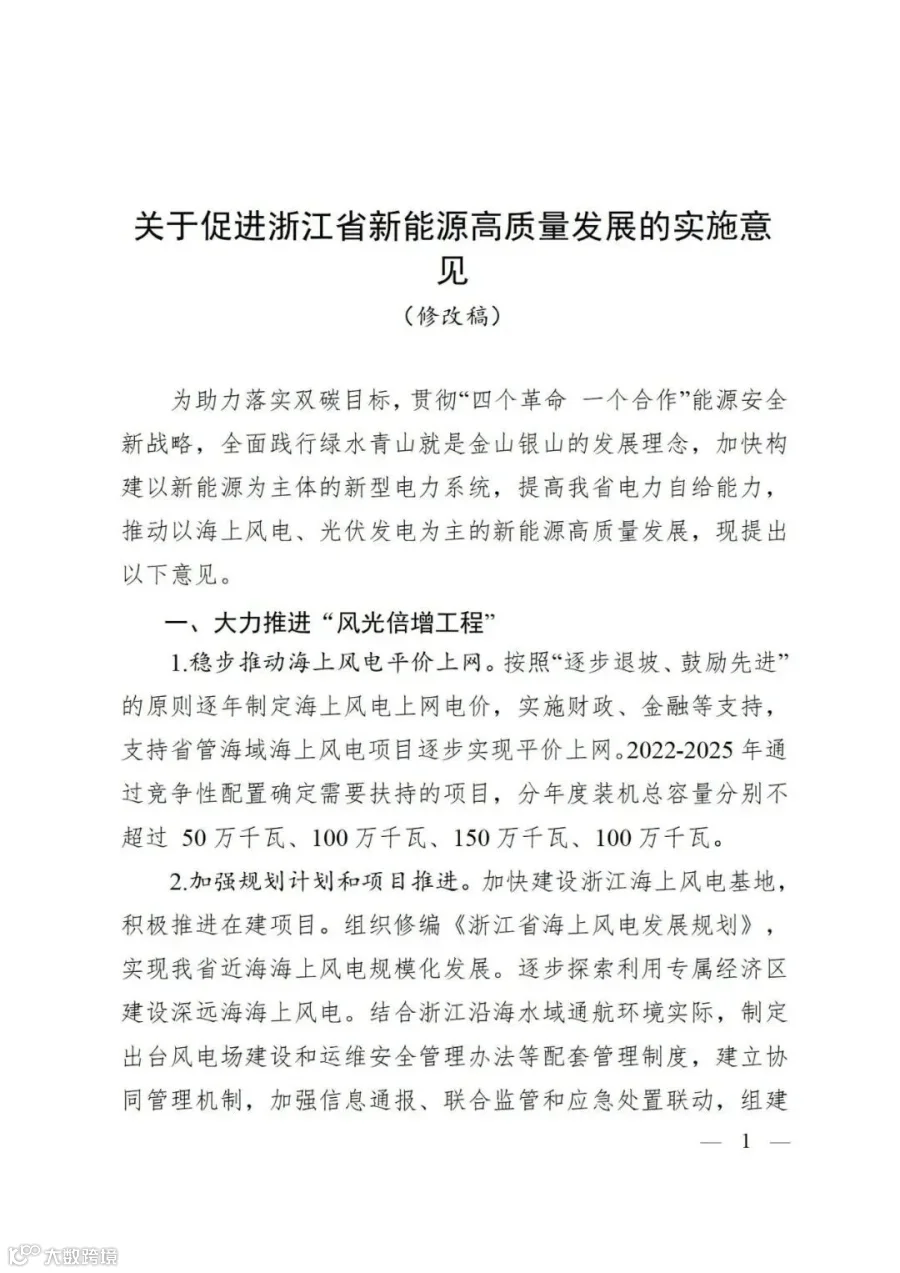 发展的实施意见(修改稿)》,加快构建以新能源为主体的新型电力系统,提高浙江省电力自给能力,推动以海上风电、光伏发电为主的新能源高质量发展。