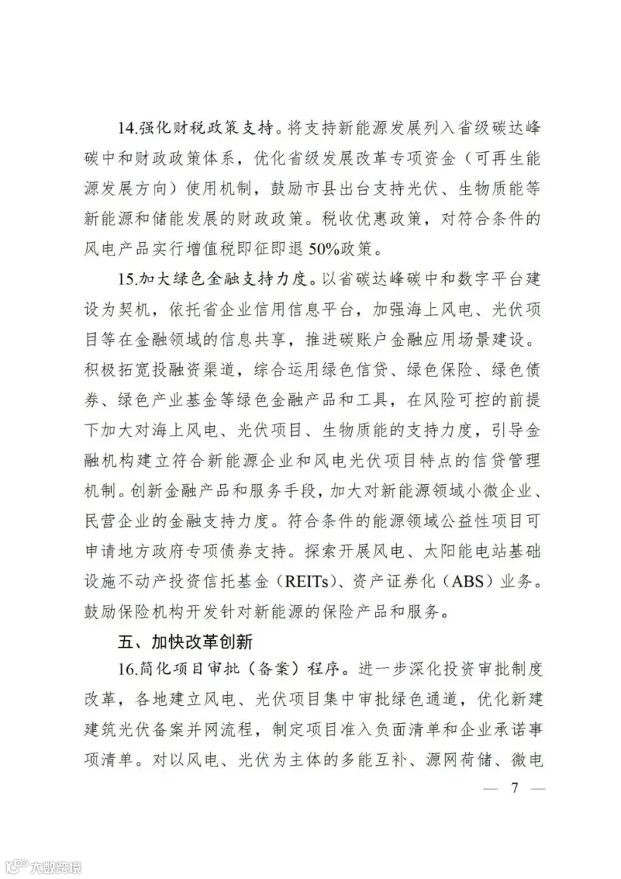 政策支持。鼓励市县出台支持光伏、生物质能等新能源和储能发展的财政政策,税收优惠政策,对符合条件的风电产品实行增值税即征即退50%政策。