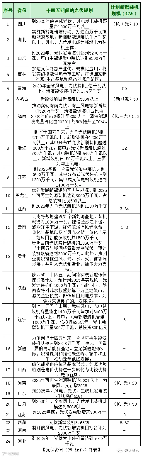 河南省“十四五”规划,制订的风电、光伏新增装机目标合计为2000万千瓦,并支持分布式及光伏+。