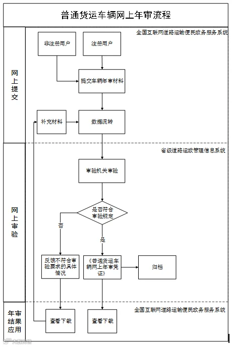 可通过全国互联网道路运输便民政务服务系统办理全国普通货运车辆网上年审业务。道路货物运输经营者在非车籍所在地窗口办理网上年审业务的,窗口办事人员应协助办理。
