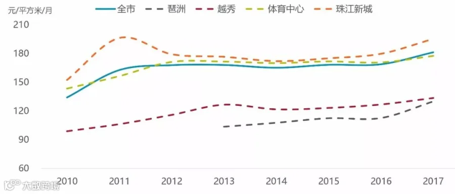 随着对广州写字楼市场的看涨以及可选面积的减少,2017年末,广州核心商圈甲级写字楼市场平均租金录得每平方米每月181.3元,较2016年末上升7.4%。作为全市体量最大的商务区(占总存量的65.5%),珠江新城的平均租金继续引领全市,每平方米每月195.2元,同比上升8.6%。