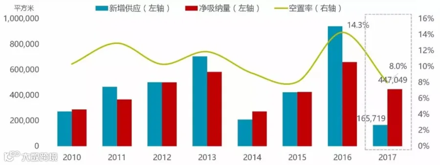 2017年,广州甲级写字楼市场一度处于短暂供应回落期,全年合计新增供应面积约16.5万平方米,同比下降82.4%。不过,有限的供应为市场提供了消化库存和优化市场结构的良好时机,2017年全年,广州甲级写字楼市场净吸纳量录得447,049平方米,为全年供应的2.7倍,推动空置率同比下降6.3个百分点。