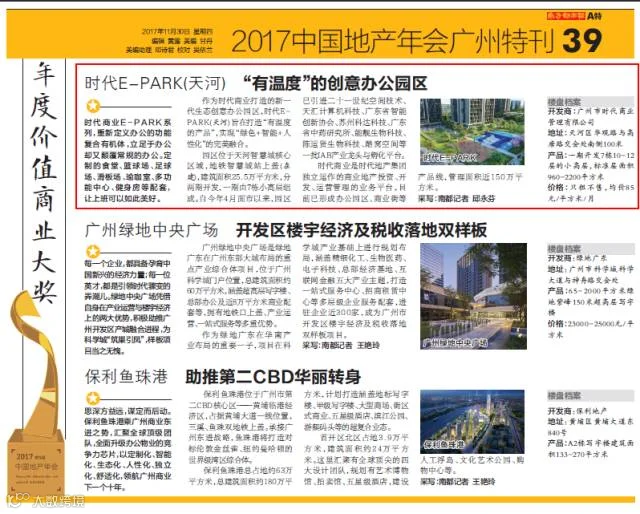 11月30日,时代商业旗下重点项目——时代E-PARK(天河)获得了2017中国地产年会特刊评选的“年度商业价值大奖”。